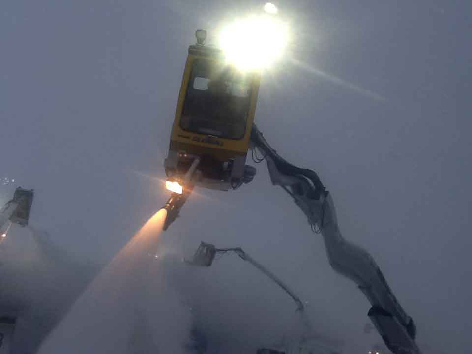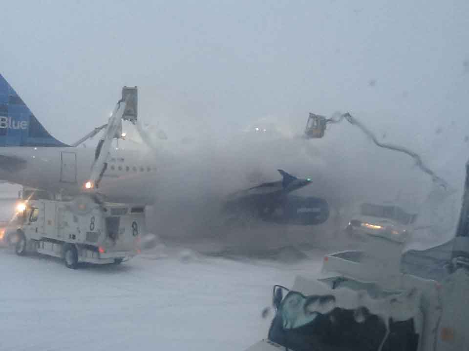 “We had a front row seat for this show,” said Andrew Orlander, passenger on the flight. “I had my ipad against the window, snapping some of the most unusually beautiful photos I’ve ever taken.” The de-icer trucks came with men attached to bird’s nests, spraying antifreeze all over the wings. The sight was surreal, like an airport disaster, except the smoke in the air was snow, mixed with de-icer fluid, shot in sharp spray along 3 aircraft that intended to beat the weather.